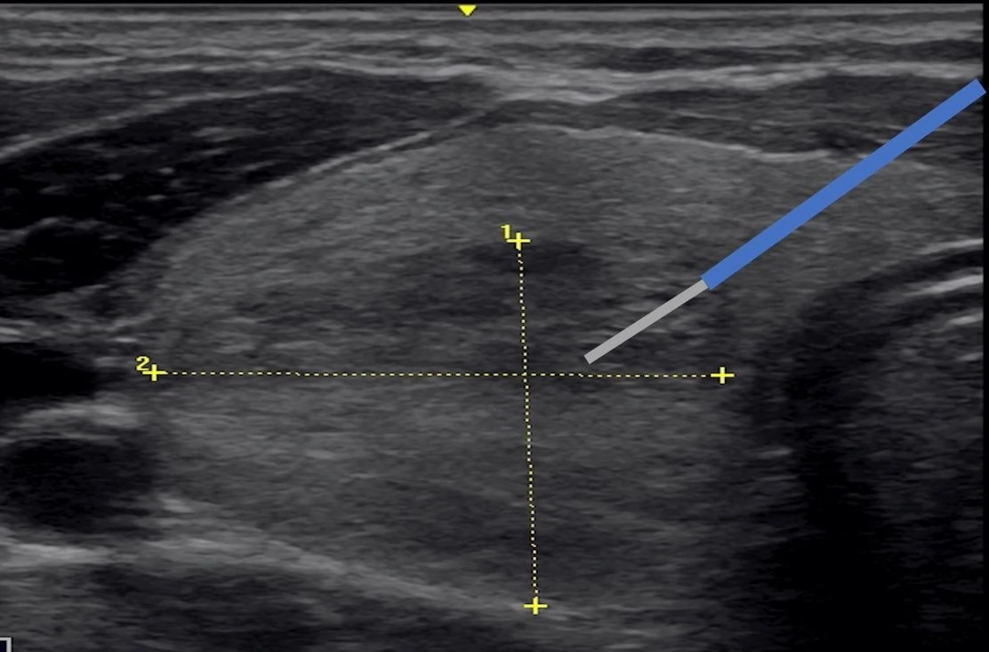 Thyroid nodule ablation uses heat to shrink or destroy thyroid nodules without surgery. The most common technique is radiofrequency ablation (RFA). Under local anesthesia and ultrasound guidance, a thin probe is inserted through the skin into the nodule. The probe emits controlled heat to target and break down the nodule tissue, while surrounding healthy tissue is preserved. This allows hormone secretion by the healthy tissue to continue unaffected. The procedure typically takes less than an hour, requires no stitches, and is performed on an outpatient basis — meaning patients can go home the same day. Over 12 months, the treated nodule(s) gradually shrinks, relieving symptoms and improving cosmetic concerns.
